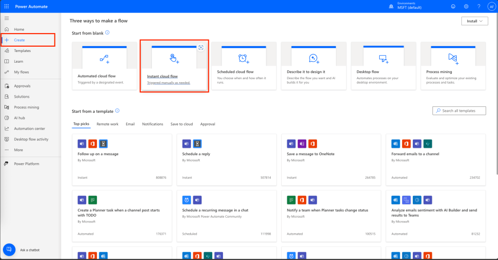 Create a Flow: Click on “Create” and choose “Instant cloud flow.”