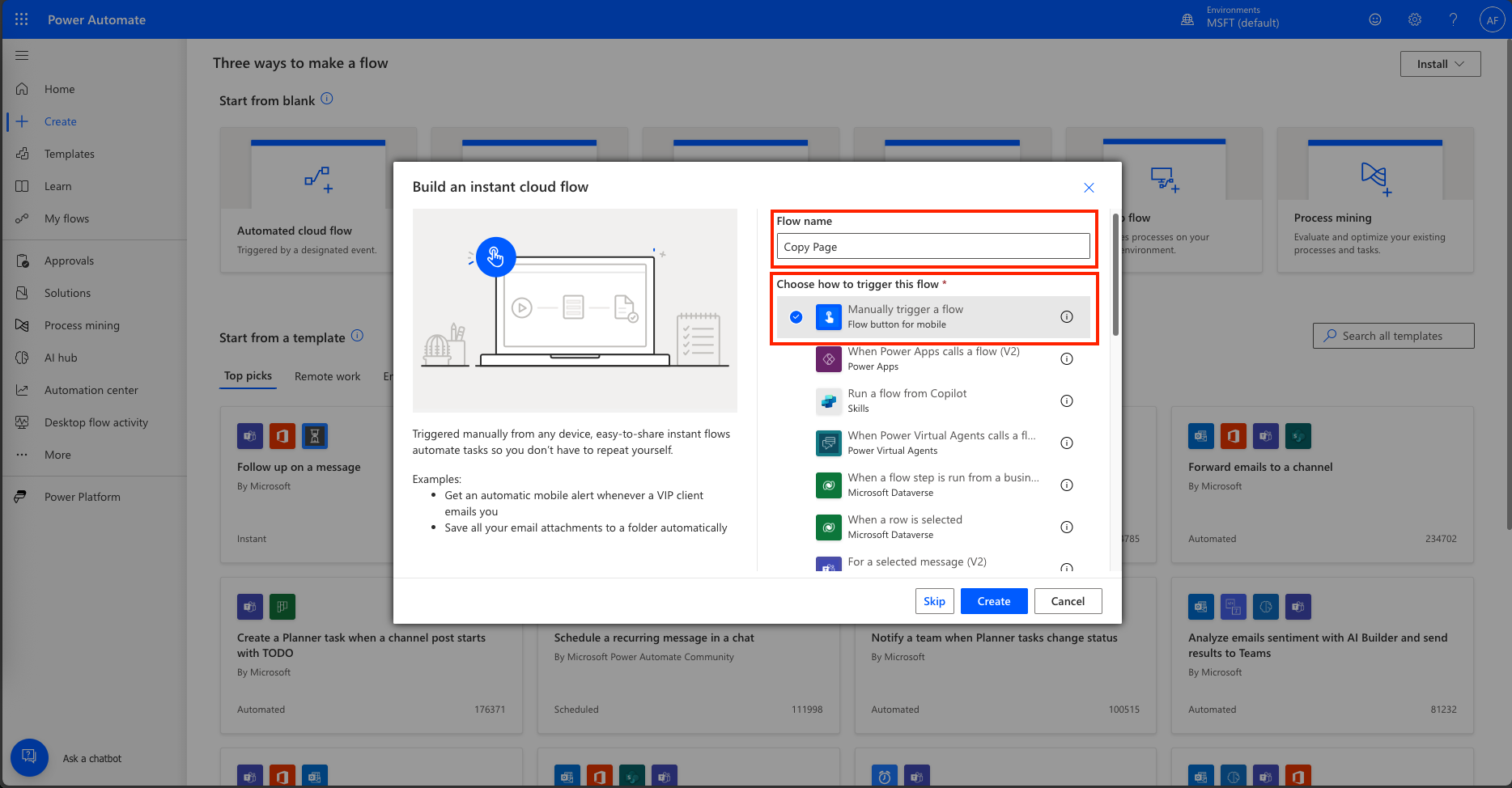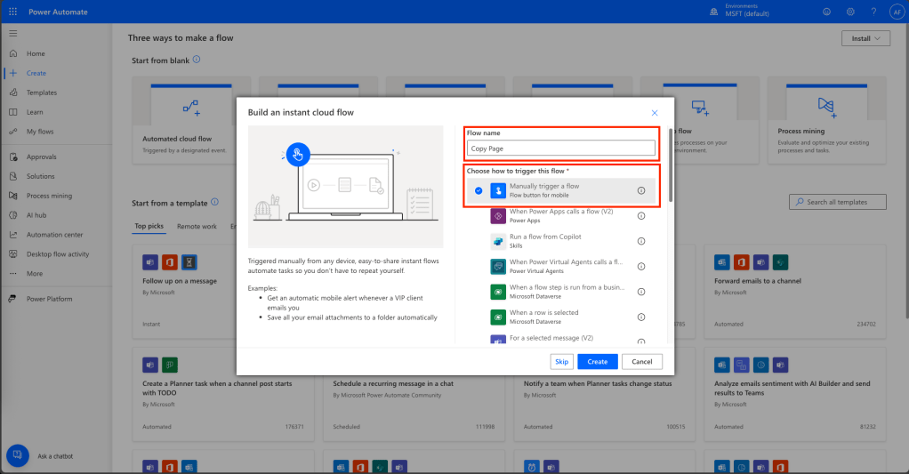 . Add a Flow name and choose “Manually trigger a flow.”
